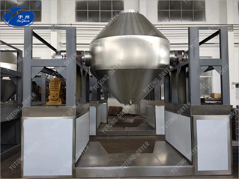 1、The double-cone rotary vacuum dryer is a double-cone rotary tank, the middle of the equipment is cylindrical, the two ends are conical, the top end of the cone is designed for open feeding (also as a manhole), and the other end is the butterfly valve discharge. The tank body is divided into three layers inside and outside, and the heating medium of the middle jacket can be steam, circulating hot water or thermal oil, and the insulation layer is medium-alkali ultra-fine glass wool, which consumes very little energy. Inner layer feed material. When the tank is in a vacuum state, the heat medium such as thermal oil, hot water or steam is heated into the jacket, and the heat is transferred to the wet material through the inner wall of the tank.