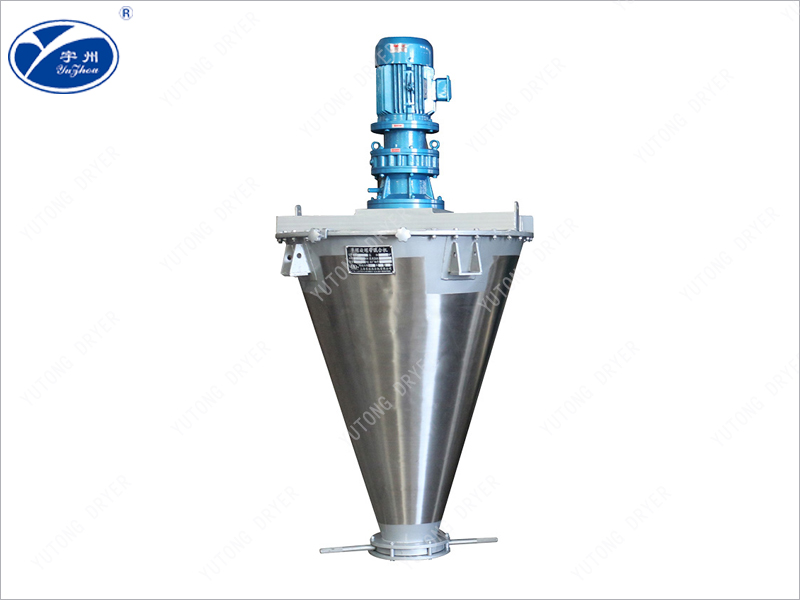 The machine has a set of motor and cycloidal pinwheel reducer to complete the rotation, the use of two screw asymmetrical mixing, so that the material mixing range is large, mixing speed is fast, and the material mixing ratio is very large. The material contact parts of the machine are made of stainless steel.