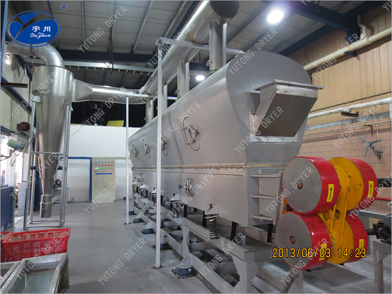 ③由于施加振動,可使最小流化氣速降低,因而可顯著降低空氣需求量,進而降低粉塵層夾帶,配套熱源,風機,旋風分離器等也可相應縮小規格,成套設備降低,節能效果明顯。可方便地依靠調整振動參數來改變在機內滯留時間。其活塞流式的運行降低了物料粒度均勻性及規則性要求,易于獲得均勻的干燥產品。