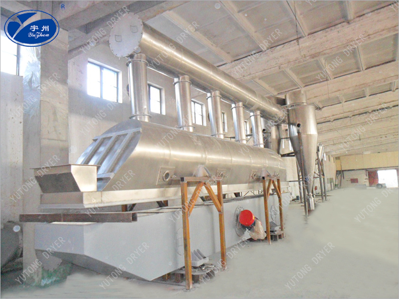 物料自進料口進入機內,在振動電機或其他方式提供的激振力作用下,在空氣分布板上跳躍前進,同時空氣經過濾后,被加熱到一定溫度,由風口進入干燥機下風室中,物料在振動力和經空氣分布板均風的熱氣流雙重作用下,呈懸浮狀態與熱氣流接觸,物料顆粒與熱介質之間進行著激烈的湍動,使傳熱和傳質過程得以強化,干燥后的產品由排料口排出,蒸發出的水份和廢氣經旋風分離器回收粉塵后,排入大氣。下床體為床層提供了一個穩定的具有一定壓力的風室。調節引風機,使上箱體中床層物料上部保持微負壓,維持良好干燥環境并防止粉塵外泄。