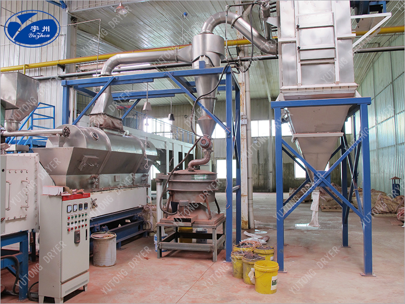 物料自進料口進入機內,在振動電機或其他方式提供的激振力作用下,在空氣分布板上跳躍前進,同時空氣經過濾后,被加熱到一定溫度,由風口進入干燥機下風室中,物料在振動力和經空氣分布板均風的熱氣流雙重作用下,呈懸浮狀態與熱氣流接觸,物料顆粒與熱介質之間進行著激烈的湍動,使傳熱和傳質過程得以強化,干燥后的產品由排料口排出,蒸發出的水份和廢氣經旋風分離器回收粉塵后,排入大氣。下床體為床層提供了一個穩定的具有一定壓力的風室。調節引風機,使上箱體中床層物料上部保持微負壓,維持良好干燥環境并防止粉塵外泄。