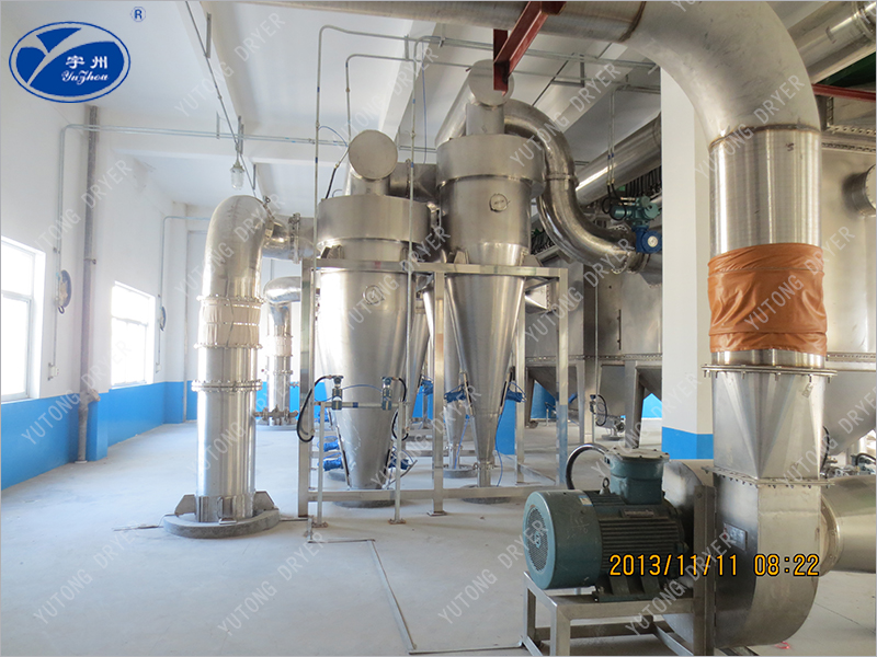 高嶺土成分主要是高嶺石,因其有良好的可塑性和高度的粘結性、優良地電絕緣性、抗酸性、耐火性等理化特點,現被許多高新技術領域所采用。各高嶺土生產企業,因其所用領域的不同采用不同的工藝和制備方法。在涂料業中所需的高嶺土工序為:粗選——破碎——干濕磨粉——磁選——壓濾脫水——干燥分級——煅燒——冷卻——產品。我司生產的XSG系列旋轉閃蒸干燥機在其工藝過程中,就是干燥分級的一步,也是比較重要的一步。最后所得的產品具有粒級分布穩定、粘濃度穩定、涂層均勻、附著力強、磨耗低等的優點。