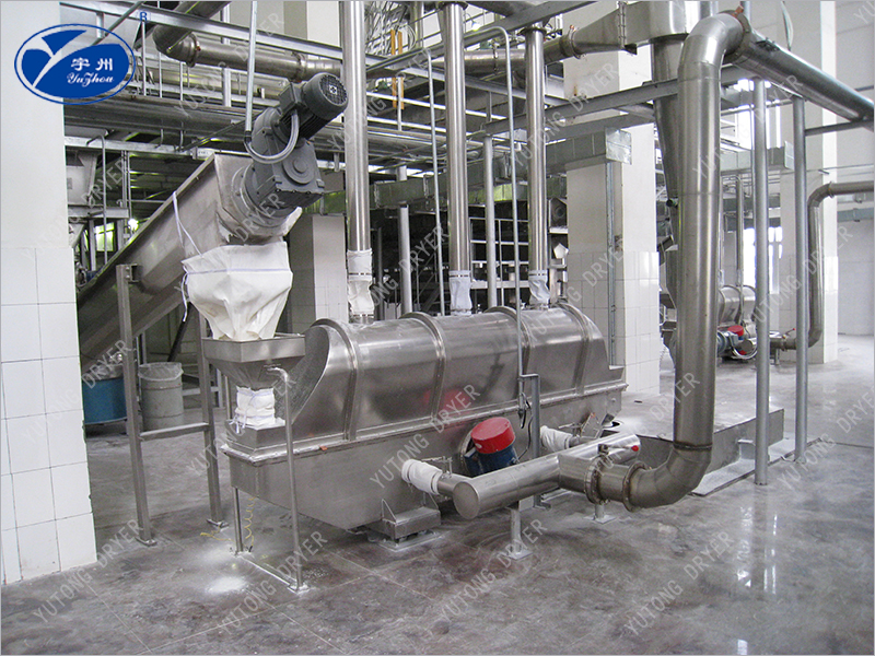物料自進(jìn)料口進(jìn)入機(jī)內(nèi),在振動(dòng)力作用下,物料沿水平面流化床拋擲,向前連續(xù)運(yùn)動(dòng),熱風(fēng)向上穿過流化床同濕物料換熱后,濕空氣經(jīng)旋風(fēng)分離器除塵后由排風(fēng)口排出.干燥物料由排料口排出。