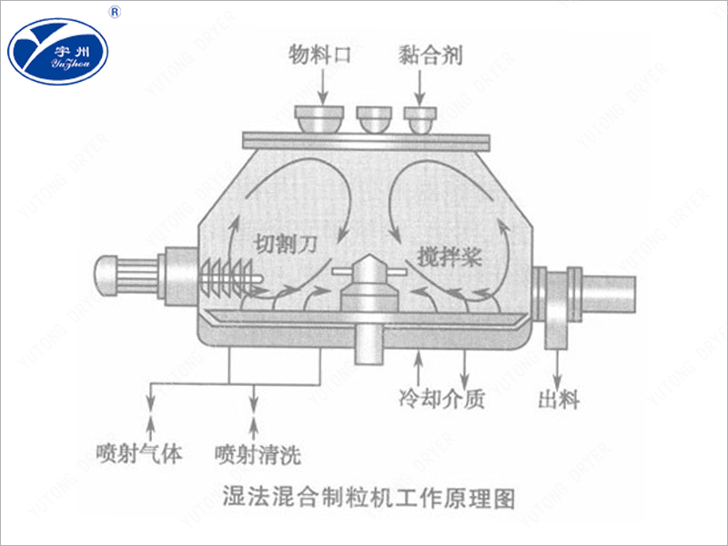 粉體物料與粘合劑在圓筒形容器中由底部混合漿充分混合成濕潤軟材,然后由側(cè)置的高速粉碎槳切割成均勻的濕顆粒。