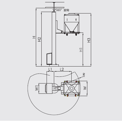該機只要由立柱、轉(zhuǎn)動底盤、提升叉架、液壓系統(tǒng)和控制系統(tǒng)組成。工作時將裝滿物料的料斗推入提升叉架上,操作提升操作桿,將料斗提升到加料高度后轉(zhuǎn)動立柱與加料設備對接,打開出料蝶閥,使物料轉(zhuǎn)移到下一工序設備。