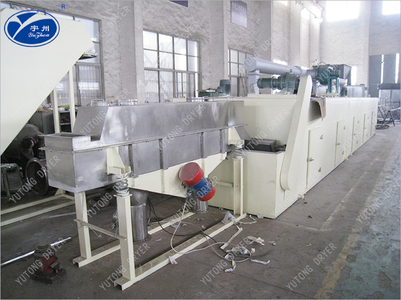 Питатель равномерно разбрасывает материал по сетке, которая изготовлена из шелковой сетки из нержавеющей стали 12 - 60. Перетаскивается приводом и перемещается внутри сушилки. Сушилка состоит из нескольких блоков, каждый из которых имеет отдельный цикл горячего воздуха. Часть выхлопных газов выделяется специальными увлажняющими вентиляторами, а выхлопные газы контролируются регулирующим клапаном. Горячий воздух проходит снизу вверх или сверху вниз через материал, проложенный на сетке, и нагревается и высыхает при удалении влаги. Сетевая лента движется медленно, скорость работы может свободно регулироваться в соответствии с температурой материала. Сухая продукция постоянно попадает в питатель. Элементы контура вверх и вниз могут быть гибко настроены в соответствии с потребностями пользователя, количество единиц может быть выбрано по мере необходимости。